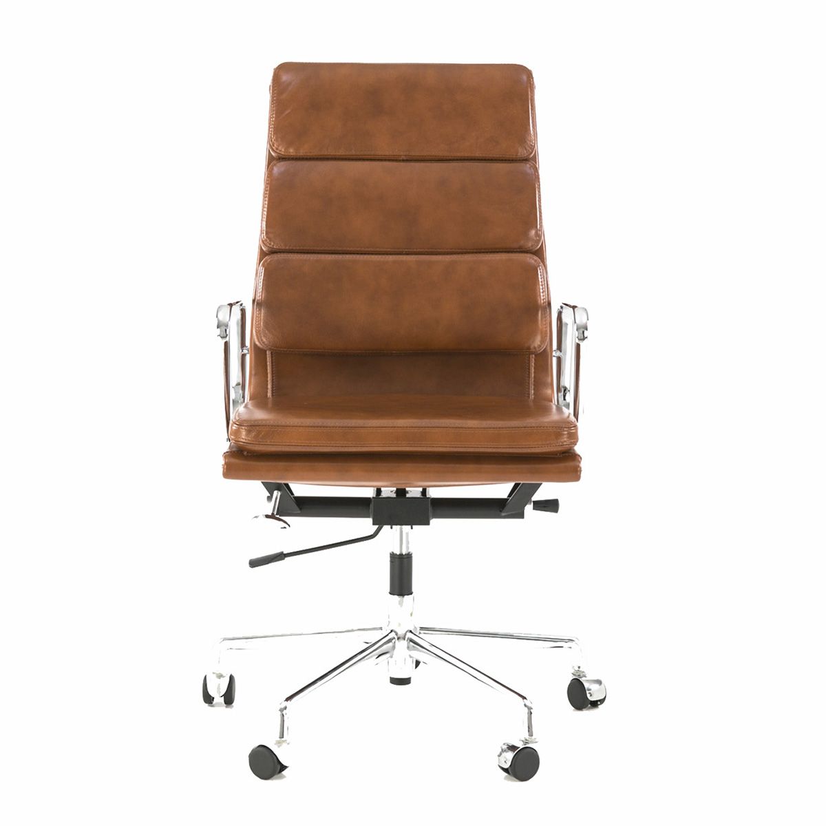 The Eames Thin Pad EA 219 Office Chair was designed in 1969. The construction and design is identical to the famous Eames Soft Pad Group Chairs. The ribbed sections are available in premium and deluxe full Italian leather, as well as a range of fabrics. The ripped cushions make the EA 219 Thin Pad Chair very comfortable. Our EA 219 Eames Office Chair is reproduced to the style of the original design. Chromed Soft Pad frame as per the original design, Full Italian leather front and back of the chair, ribbed fabric and black plastic floor protectors. Height: 70cm Depth: 58cm Width: 55cm Seat Height: 46cm